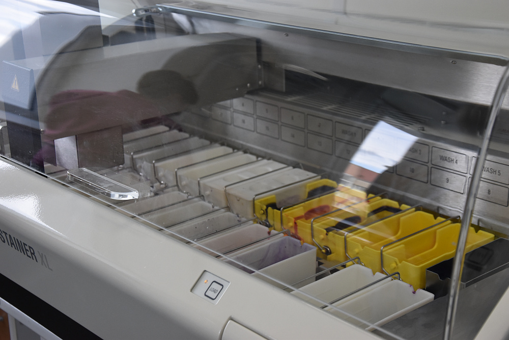 Наши лаборатории сегодня полностью автоматизированы. В отделении патанатомии появился вытяжной шкаф для окраски мазков. Клинико-диагностическая лаборатория приумножилась двумя новыми анализаторами и модульной автоматизированной системой постаналитической обработки образцов.